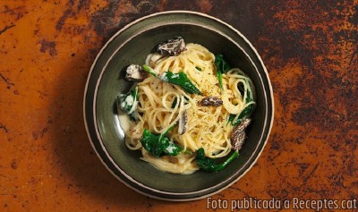 Espaguetis amb múrgoles i espinacs a la crema de mostassa