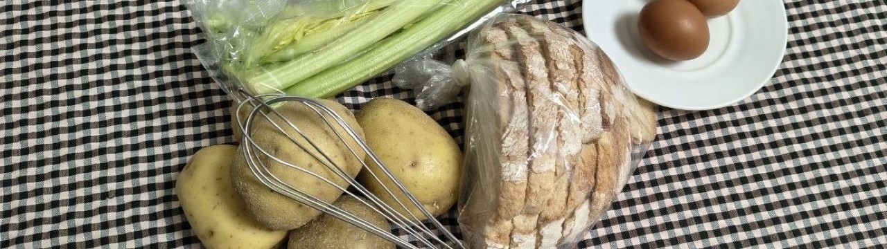 Primerament, pelem les patates, rentem les pells i les posem a l'olla amb: la pastilla de brou, el porro, la branca d'api, la ceba pelada, i deixem que cogui tot plegat durant quaranta cinc minuts.