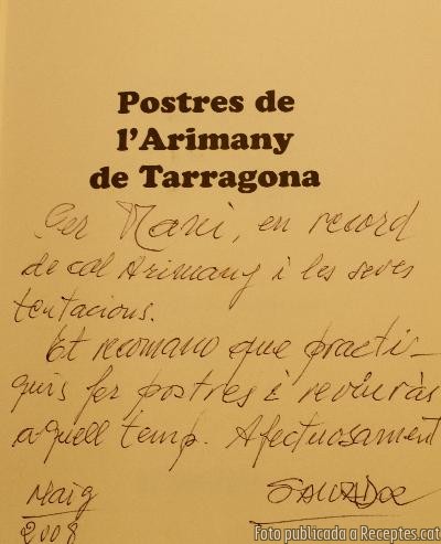 La recepta d'avui és la que està a la pàgina 44 del llibre "Postres de l'Arimany de Tarragona" de Salvador Arimany i Minguella (Cossetània Edicions). Amb aquesta recepta vull retre homenatge a qui ha fet tant per la pastisseria a Tarragona. Vaig demanar permís a la seva filla Rosó per a publicar-la i aquí la teniu. La veritat és que han sortit unes trufes boníssimes. Amb les quantitats indicades n'he fet 90. Les he congelat i sortiran dissabte a la festa d'aniversari de la meva néta.