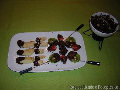 Anar posant els trossos de fruita dins la xocolata fins a la meitat, treure'ls i posar-los damunt una safata, dins la nevera, fins que refredin.