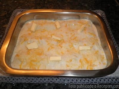 Posem el formatge ratllat per sobre i també li posem trossets de mantega escampats per sobre.