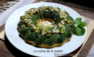 Col.loquem amb un motlle de silicona (apte per anar al micro), primer la crema d'espinacs i sobre la de cigrons, posarem sobre el plat del micro, el motlle i courem 8 minuts al 100% de potencia, deixem reposar 2 minuts i tornem a coure 3 minuts més.