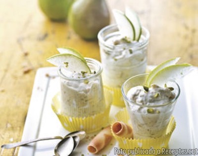 Barreja bé la crema de iogurt i la de pera, afegeix al gust, el licor (Williams) de pera i barreja suau ment amb la crema batuda.