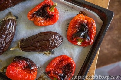 Cou uns 45 minuts en la meitat superior del forn fins que les verdures estiguin suaus, i la pell estigui una mica fosca.