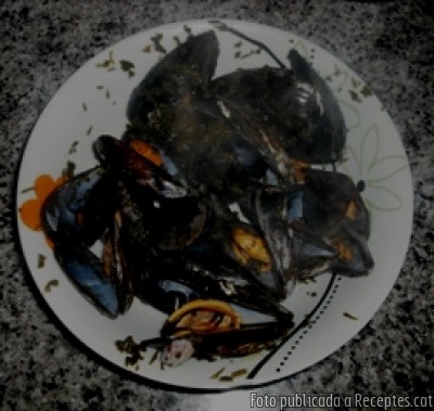 - Per 3 persones 1 kilogram de musclos de roca-250 cl de vi blanc-Julivert fresc picat-